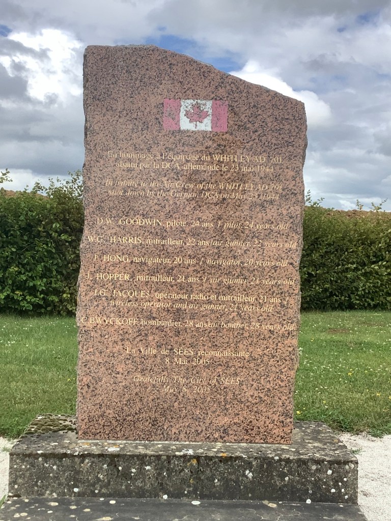 Six young Canadian lads were flying over Sées dropping leaflets warning the local French civilians of imminent RAF raids on strategic targets so that they could get out of the way unhurt. But the lads’ plane caught some German flak and they crashed in the fields north of Sées, and all died.