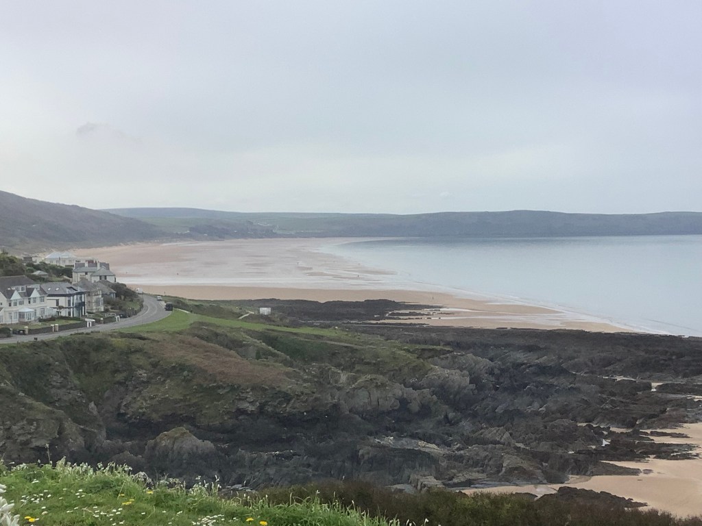 The day is cool, not cold. Slightly breezy but not windy. Spitting but not raining. Round Morte Point the size of Woolacombe bay spread out in front of me.