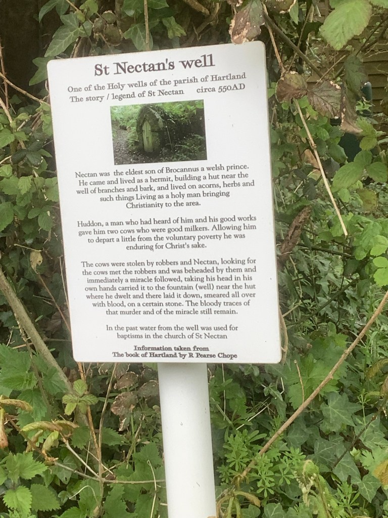 After less than two hours tarmac walking I covered the four miles to Hartland and carried on westward. Past St Nectan’s well. I hope his head isn’t flogging about somewhere on the campsite. Without his head St Nectan certainly can’t be well. Boom boom.