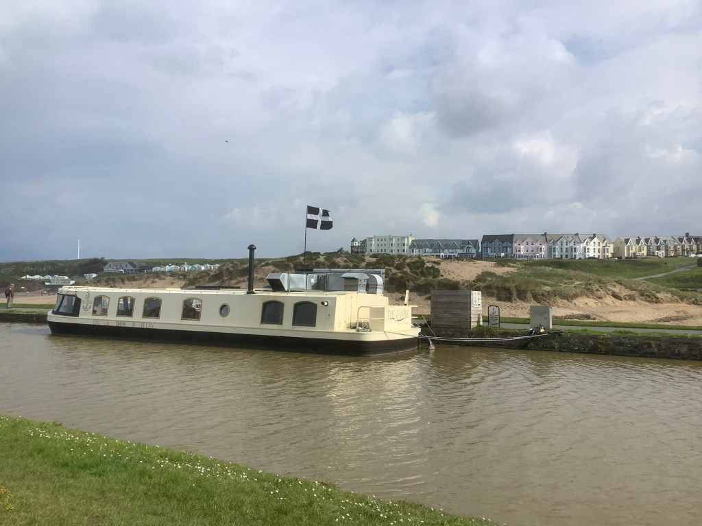 Breakfast at the Falcon Hotel was great, and I set off fed and rested. There is a canal in Bude and this grand barge, sporting a Cornish flag, was moored there, stretching the ropes in the stiff breeze.