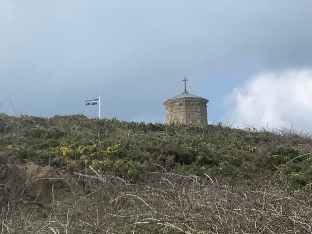 The path led over a hill towards Widemouth Bay. Passing close to the historic Storm Tower and another Cornish flag.