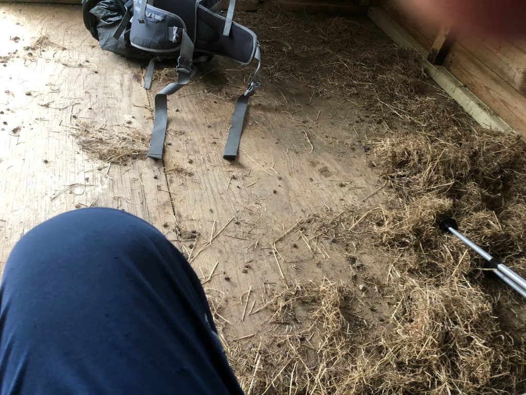 After my sandwich (cheese, red onion and mayo), I got down in my sleeping bag on top of my mattress on top of my groundsheet, on top of the poo on top of the floor. And slept. Dry and sheltered from the strong wind and incessant rain.
