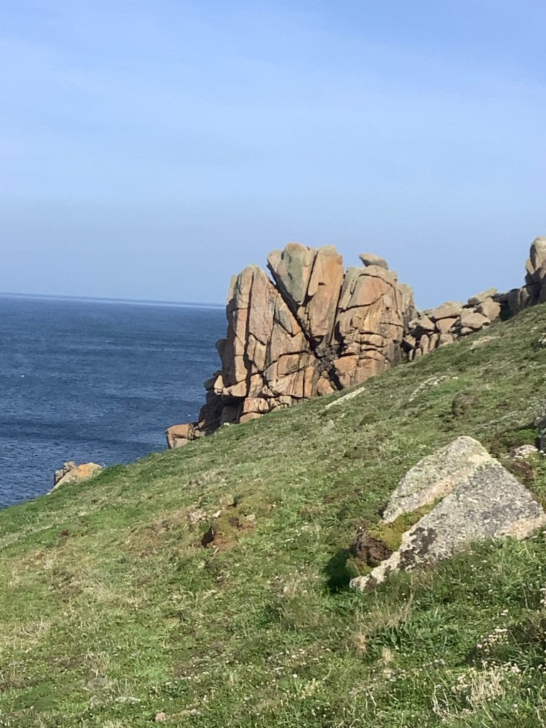At Sparrow’s Fart we got up and drove to Porthcurno on the Channel coast, parking the car up there and walking around the thin red line, although it was on land and not in the sea like my fingernail traced it!