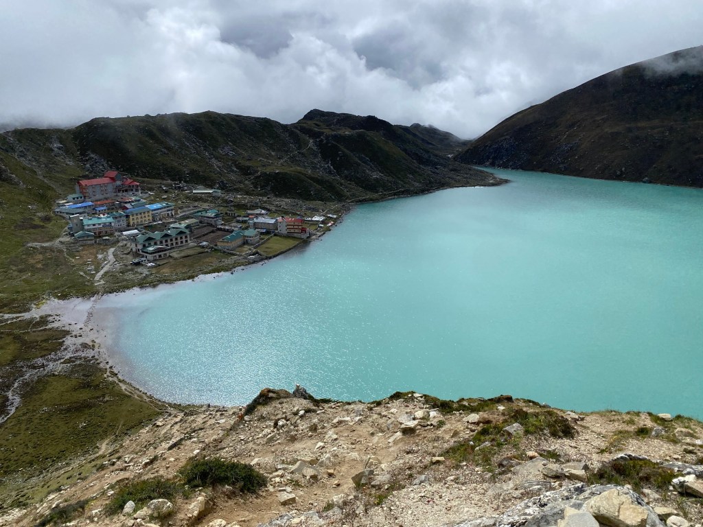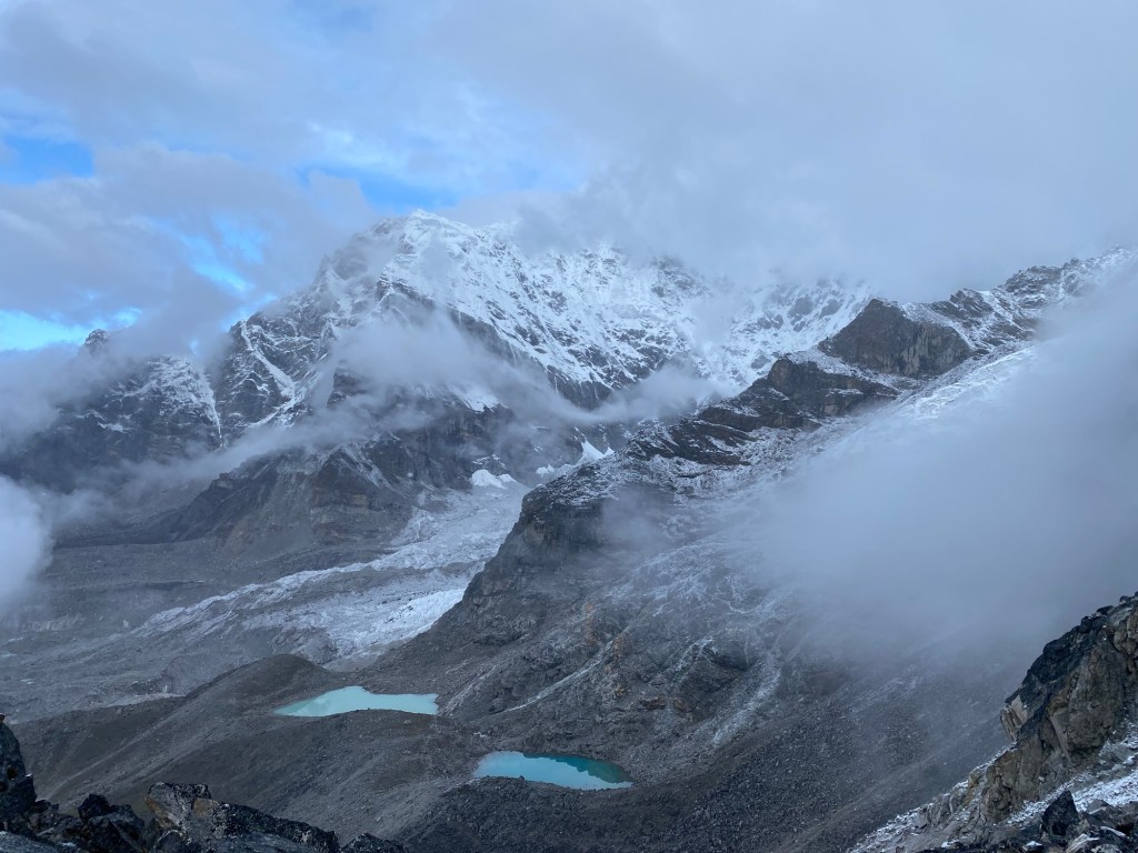 Gokyo lake appeared through the clouds, like blue opal in Lightning Ridge. We might hit target, ay.