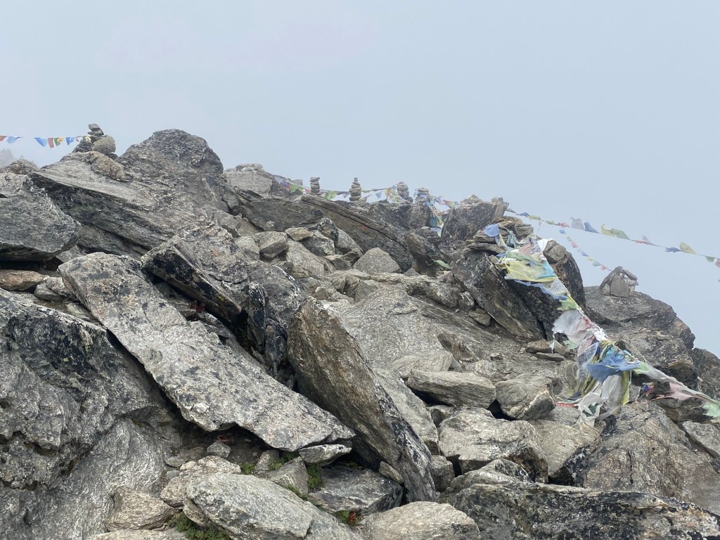 We hung around in the half light, until the South Koreans caught up and swamped us at the summit, and it was apparent that we would not get a clear view of Everest. On the way down the helicopter landing point and memorial near the bottom were barely visible, as the cloud had intensified.