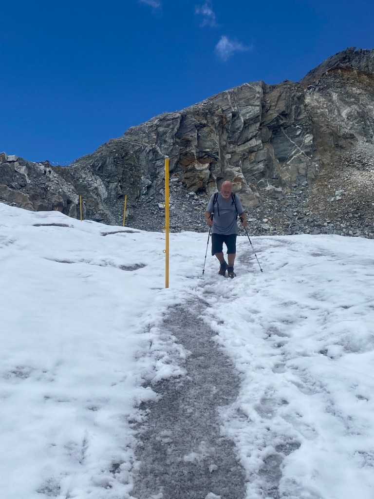 The route in front of us dropped down, again with wires, but there was considerable snow and ice for the foreseeable. What I didn’t realise was that this was another glacier of a very different kind.
