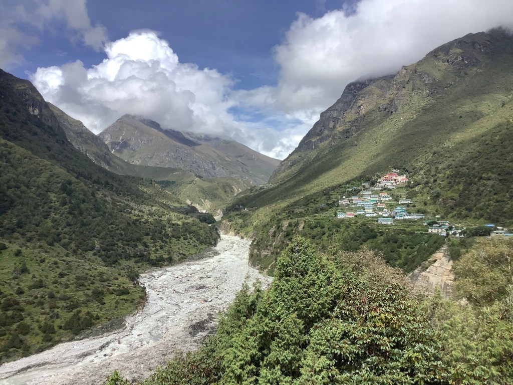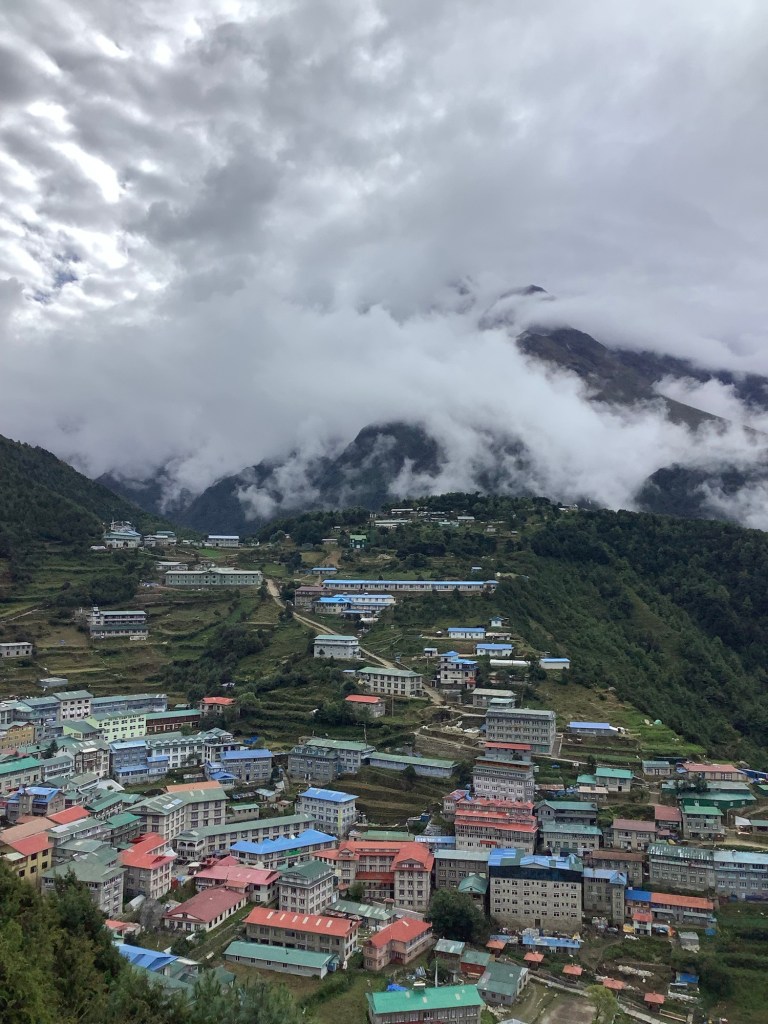 Looking back across Namche the clouds were rolling in, but we escaped the rain.