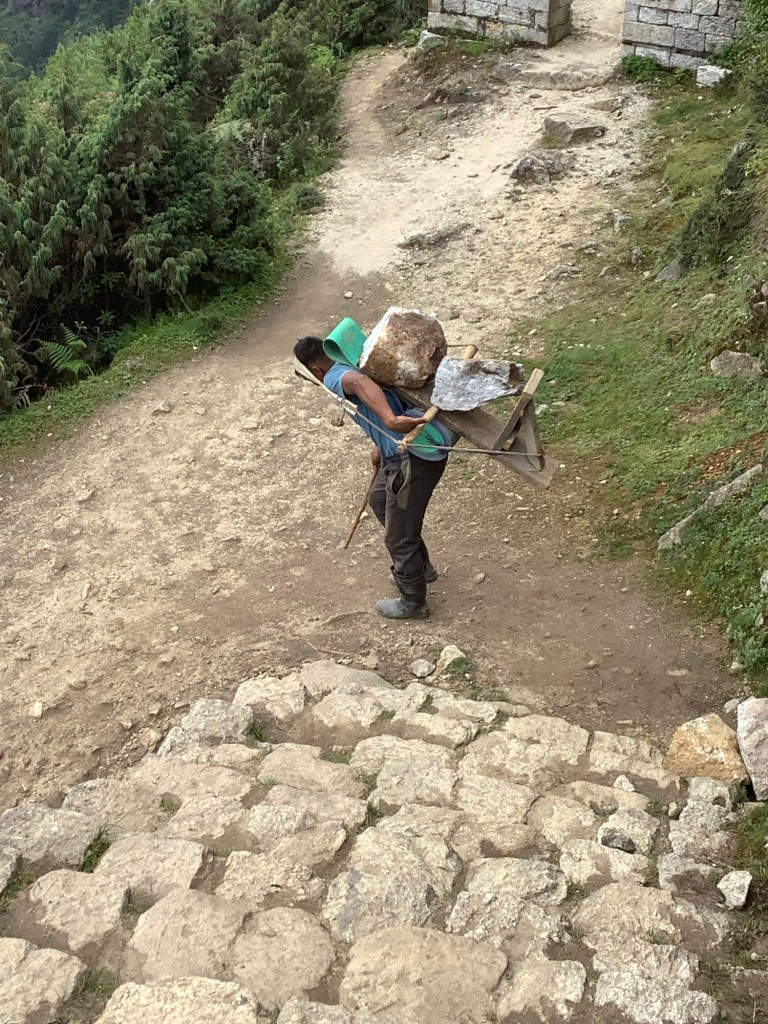 There was a small quarry around the valley side, not visible from Namche, and young men, some of whom were barely out of school, were carrying huge chunks of rock on their backs down to a few construction projects in the village.