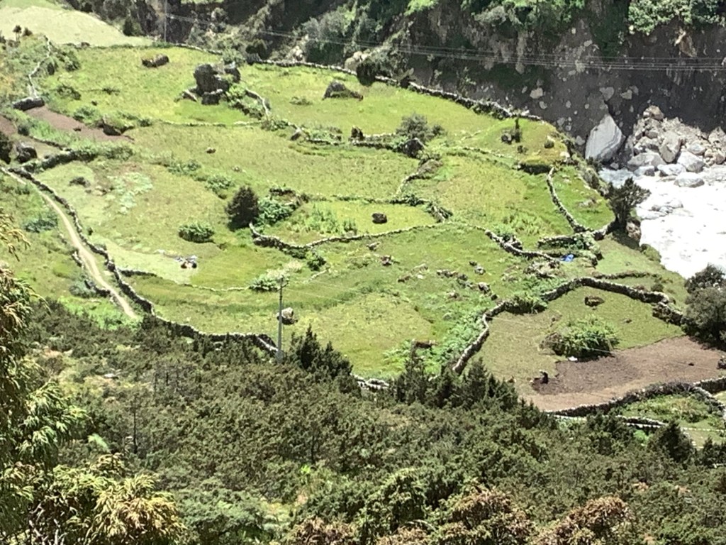 The enterprising Sherpas inhabiting this valley have built terraces and dry stone walled sections for grazing and growing. In the photo below a woman is turning over grass to plant potatoes, bottom right. Two others, middle left, are cutting hay for silage.