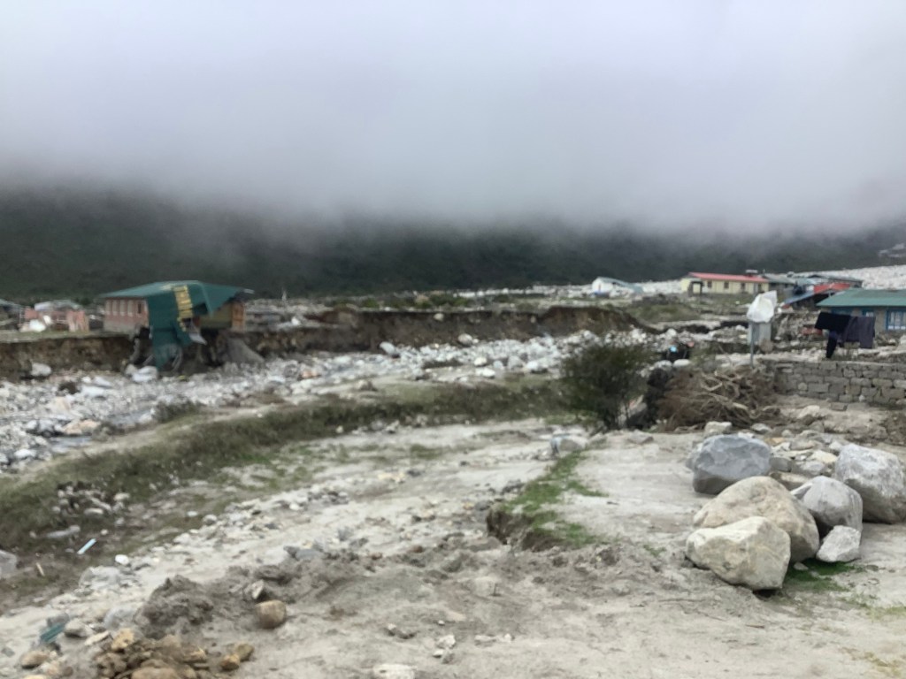 It was a difficult climb up to Thame and as we came into what was left of town the devastation was apparent. There were quite a few buildings left but some were under boulders and others had been partially washed away by the torrent.