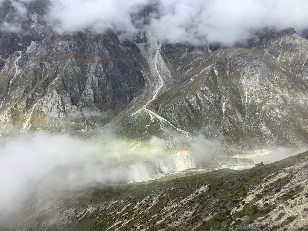 The Ngozumpo Glacier, which we’re crossing today, shoved billions of tons of earth and rocks to one side as it grew and slowly moved down the valley that it was shaping. This formed two high ridges either side of the glacier, which are being revealed more as the glacier shrinks. On the outside of these ridges, called lateral moraines, the tiny villages of Gokyo on the west, and Dragnag on the east were built.