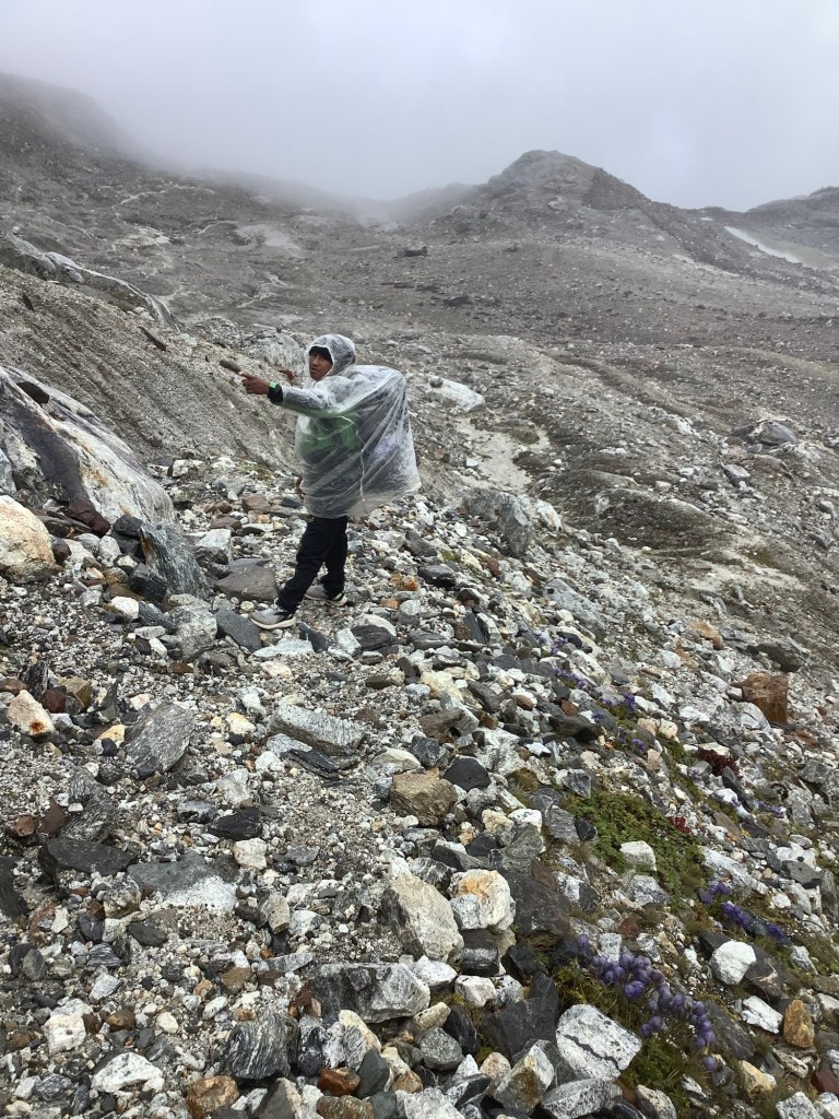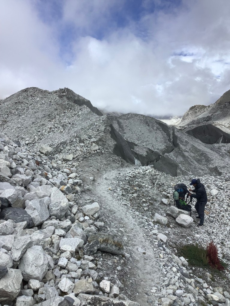 Amit found a route down. The problem with this section is that the lateral moraine, which we had to climb down, is falling onto the side of the shrinking glacier. And one area that we had to walk under was just waiting to tumble.