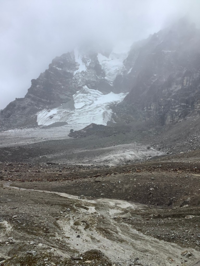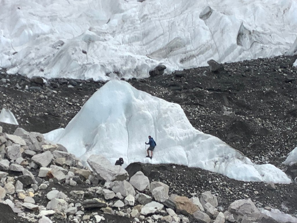 We sped down a boulder covered glacier with hanging glaciers either side.