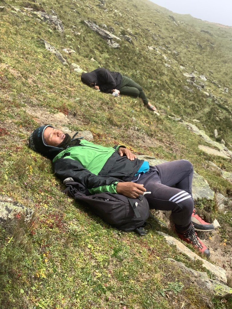 Part way up the mountain our hardy Nepali lads decided to get a kip. How come the Gurkhas are one of the best fighting regiments in the world but two of its potential members can’t walk up a hill without a sleep?