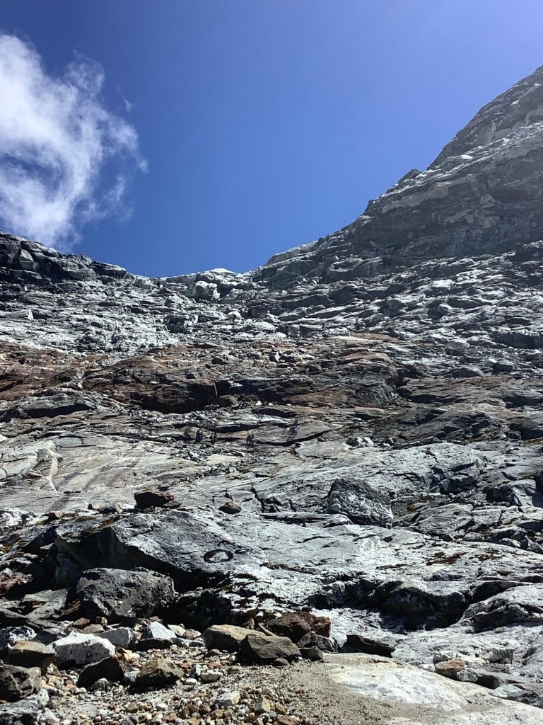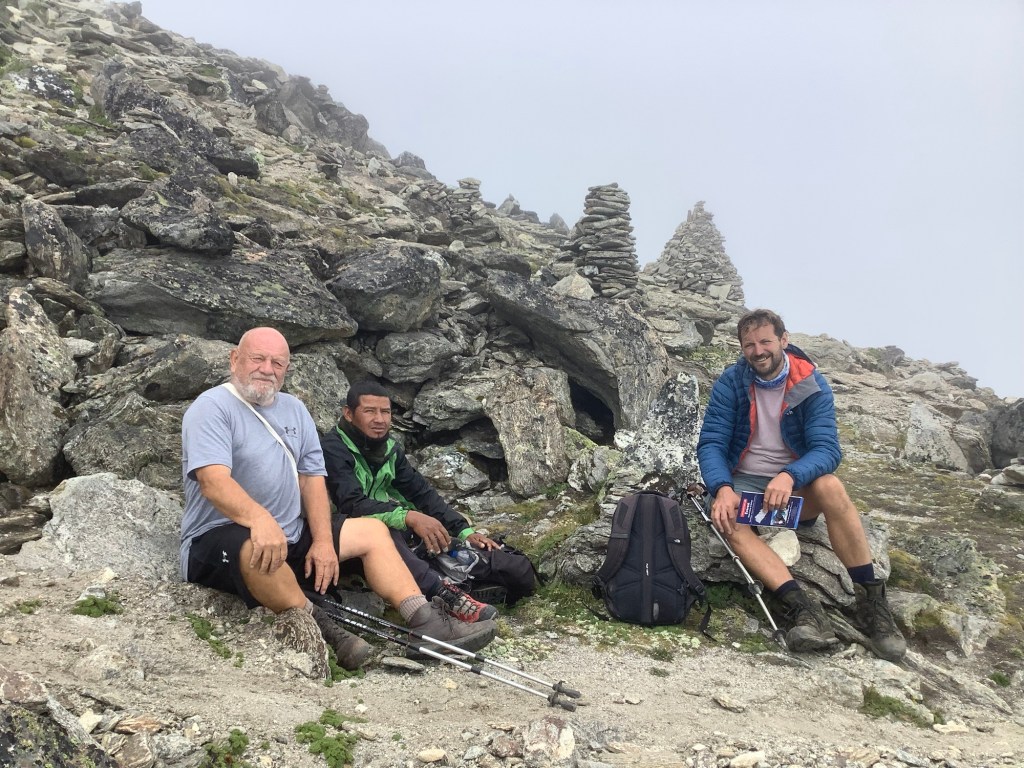 I didn’t think I could make it. At points the slope evened a bit and we could walk and breathe without too much pain. Count your steps. Try to do 20 without a stop. Short shuffles. Avoid steps and stick to slope. The pass is somewhere behind Dan.