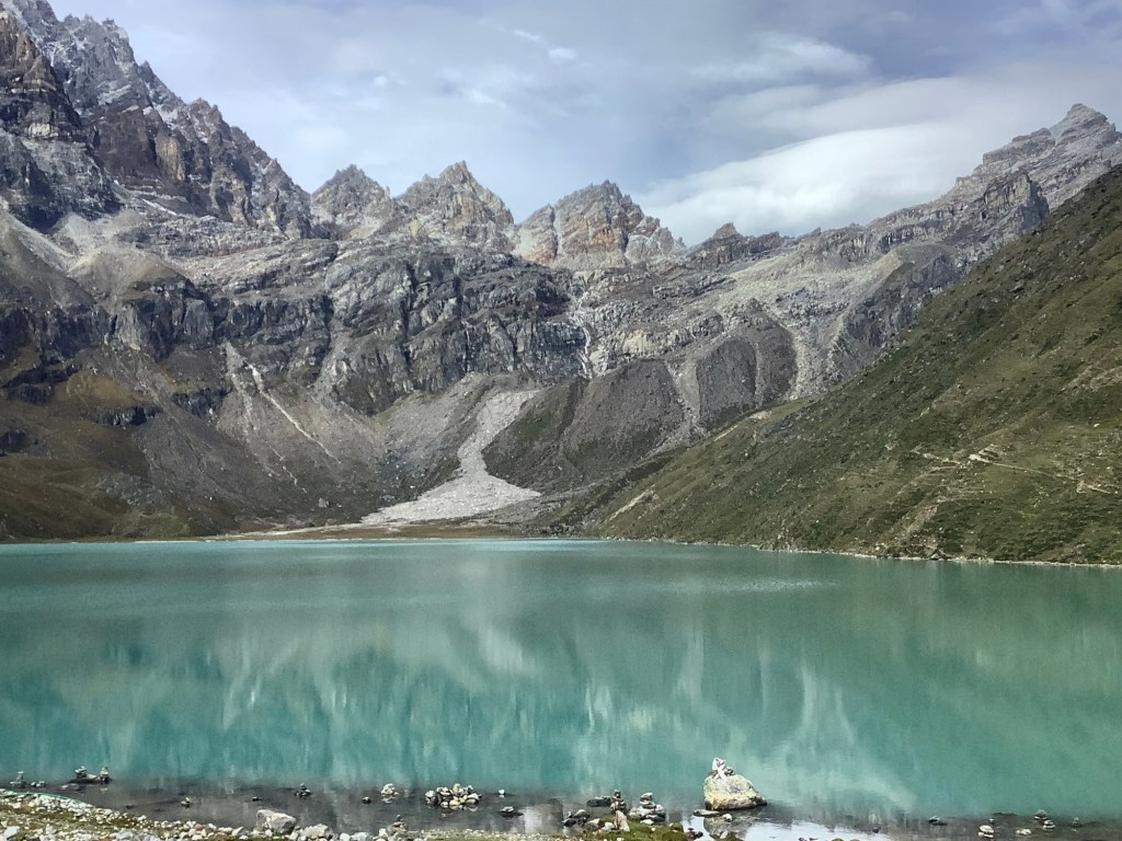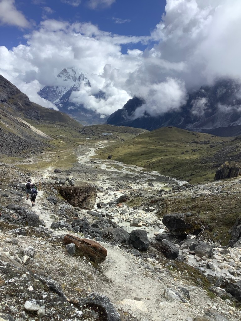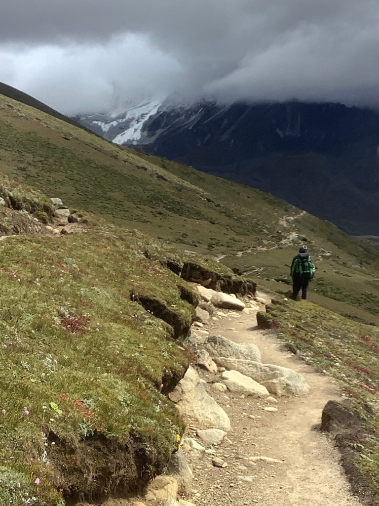 We decided to go for Renjo La. Looking down the valley the morning was dry but cloudy as we set off at a steep incline.
