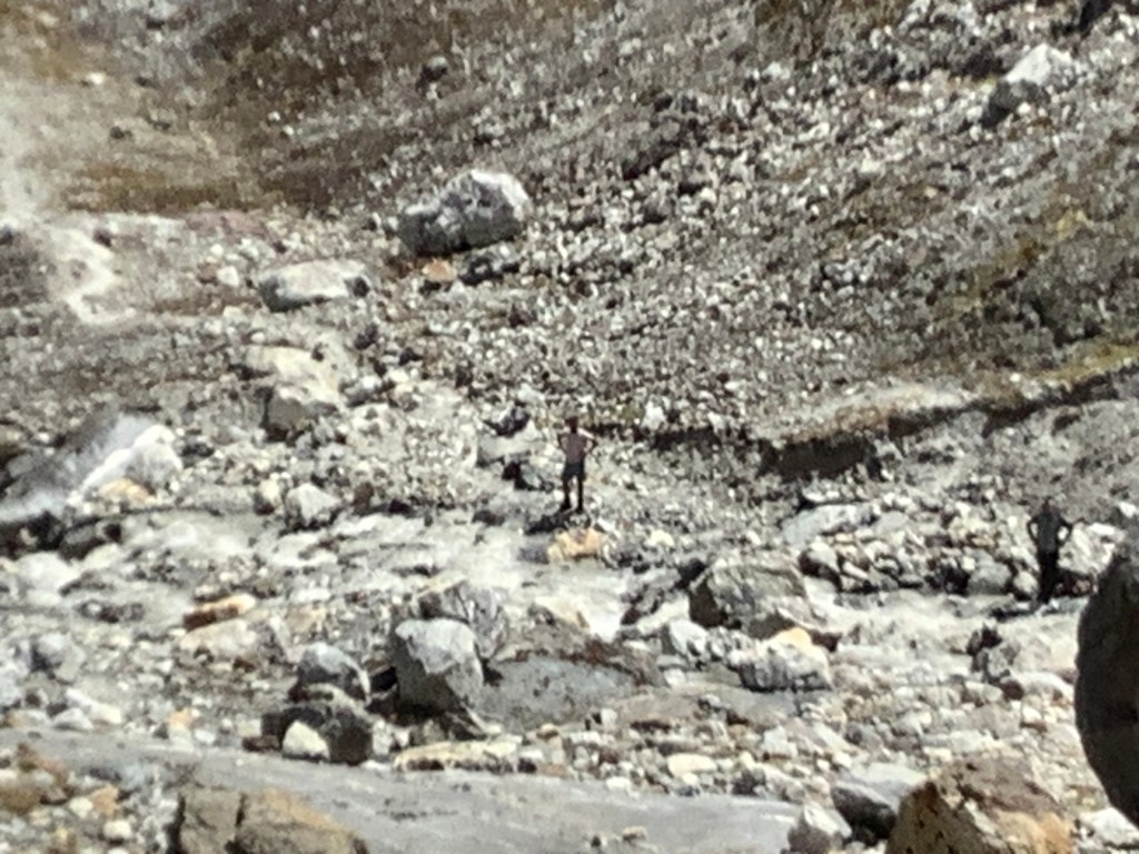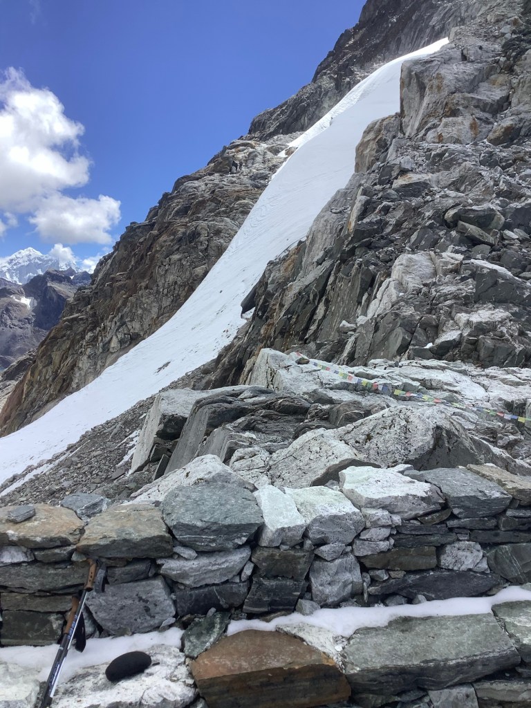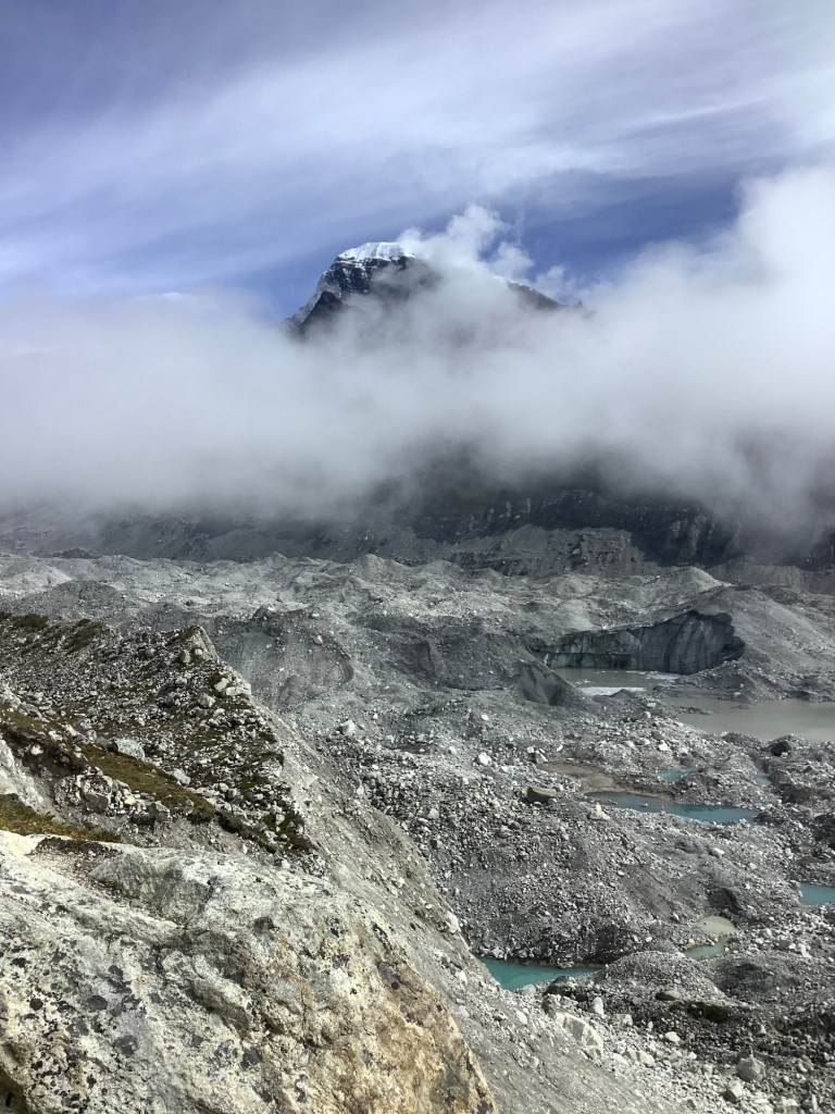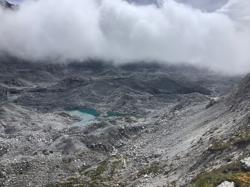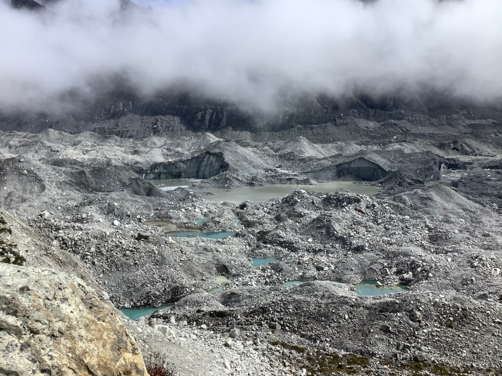 We climbed up the lateral moraine behind Gokyo and poked our noses over the edge. Southwards was where the most recent path had been, and our lads did a bit of a recce to see how we could get down to the glacier itself.