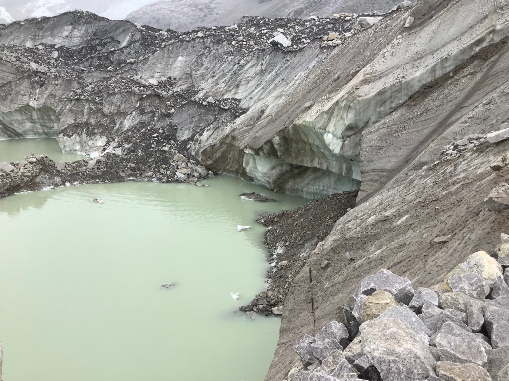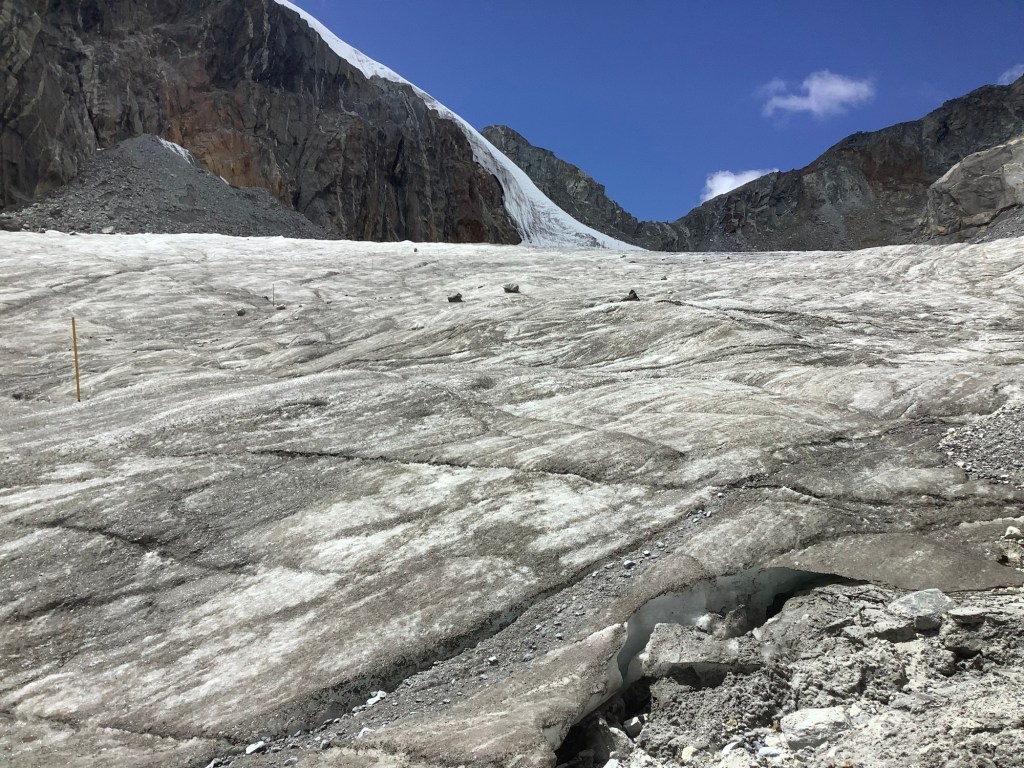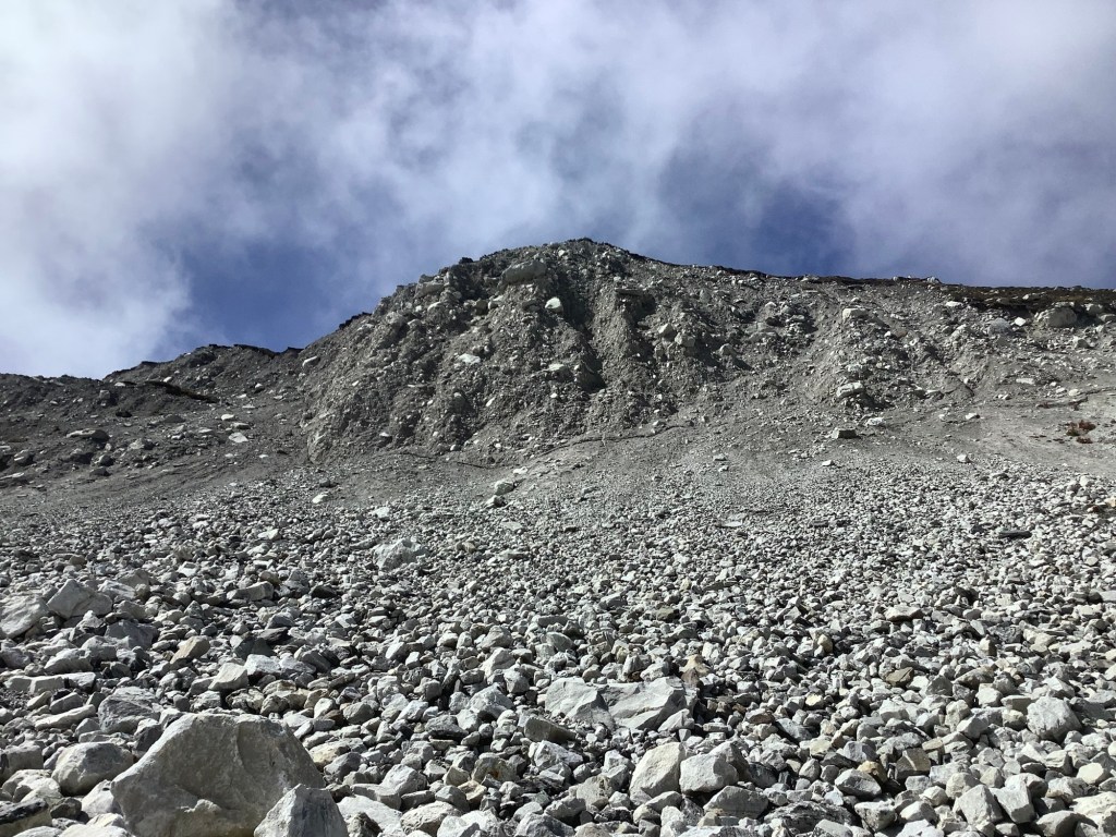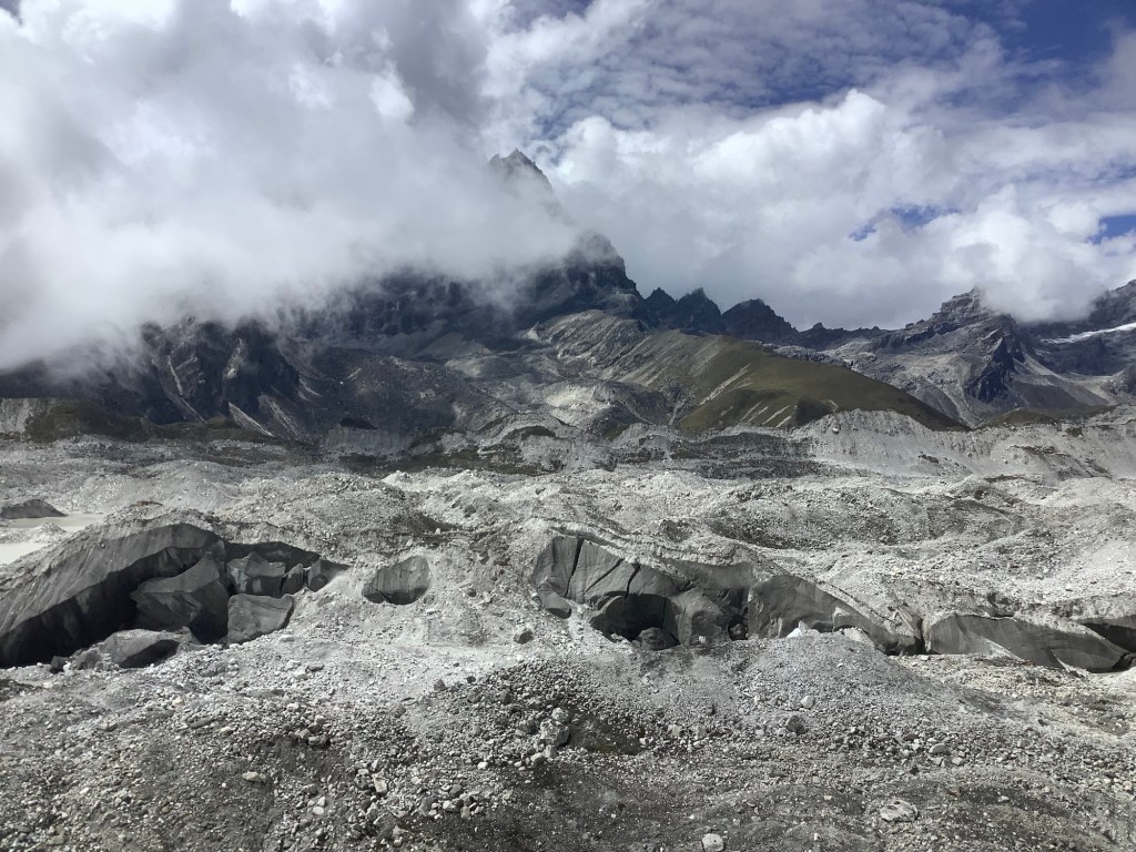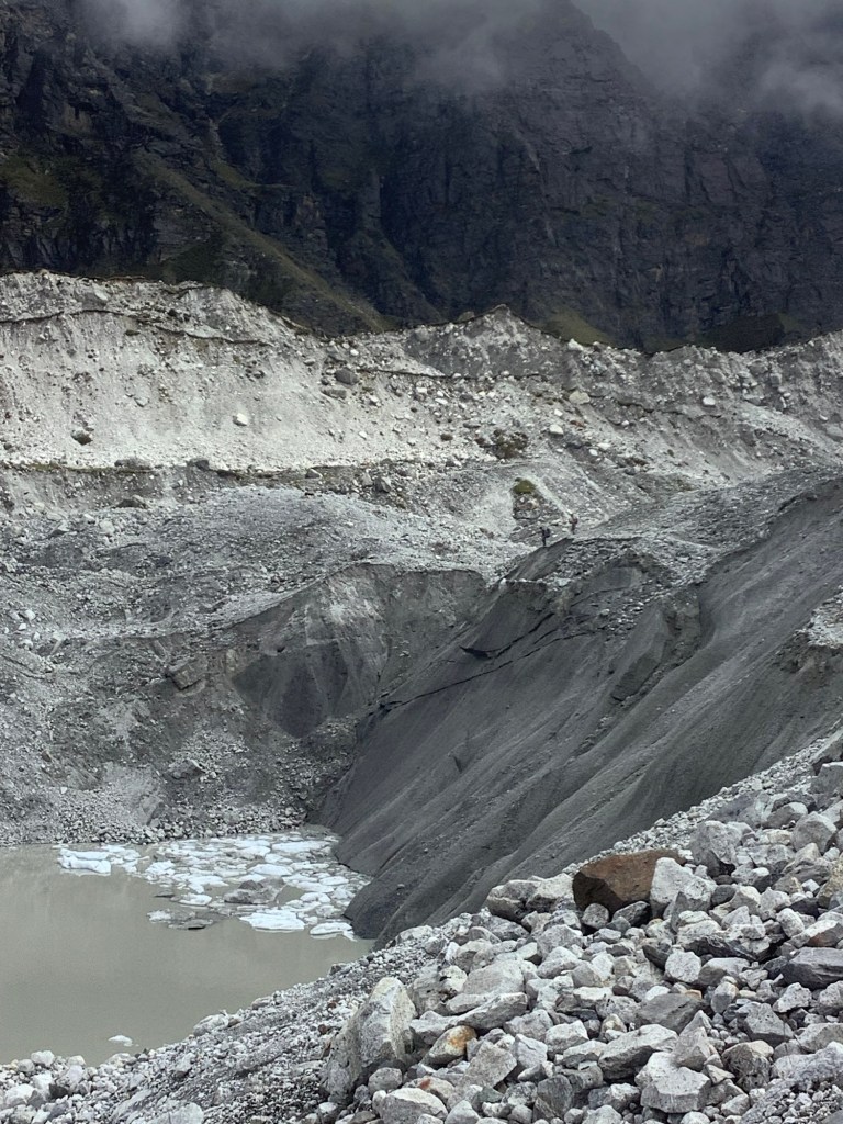 These larger glaciers have a lot of soil and rocks on their surface, to the extent that sometimes you would think you’re walking on a mountainside. Lurking sometimes many metres below is ice. At this point on the glacier the boulder and rock covering is quite thin. On those two mounds in the middle distance there is a dark covering like a roof, rocks and earth, and paler ice underneath.