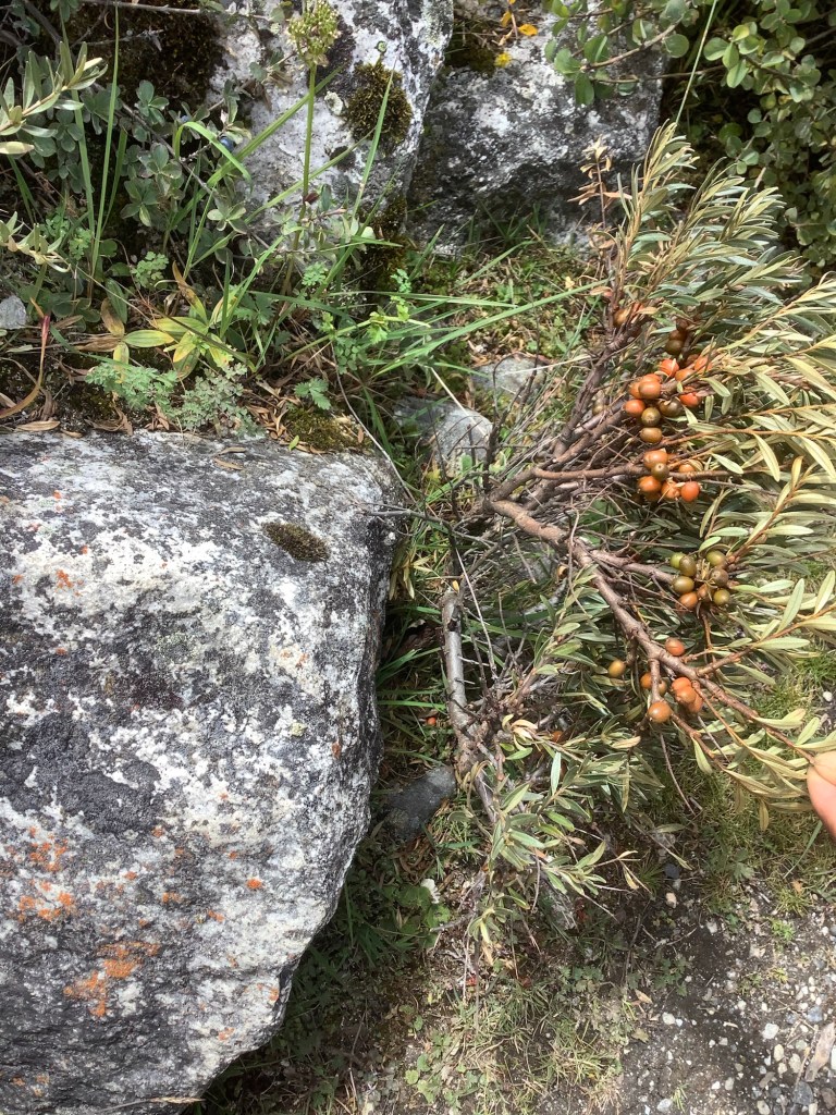 Nir and Bikram gave me a nature lesson on the track down to Dragnag. The Himalayan Pica in these parts isn’t a mouse, it‘s a small rabbit type creature, and we saw one on the rocks. There is a Yellow Bellied Weasel, and we spotted one in a dry stone wall. And this is a local berry, which the locals locally squeeze to get the juice out. Can’t remember its name but it’s great. It tastes sweet and sour at the same time. I had loads.