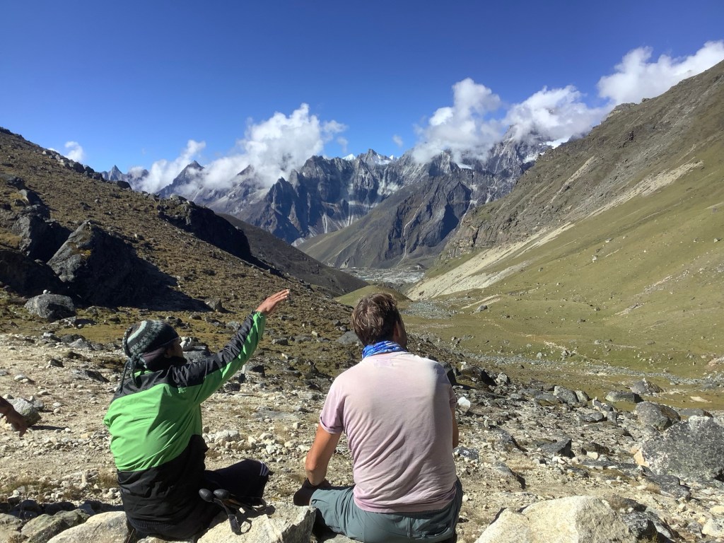 Down the valley to my right rested the village of Pheriche, with its great farming terraces tucked under the valley wall. We may be traversing the mountain but we’re slowly heading down now. Danny is fighting against it temporarily and spectacularly, climbing a proper peak and a proper pass before succumbing to the gravitational pull of Kathmandu.