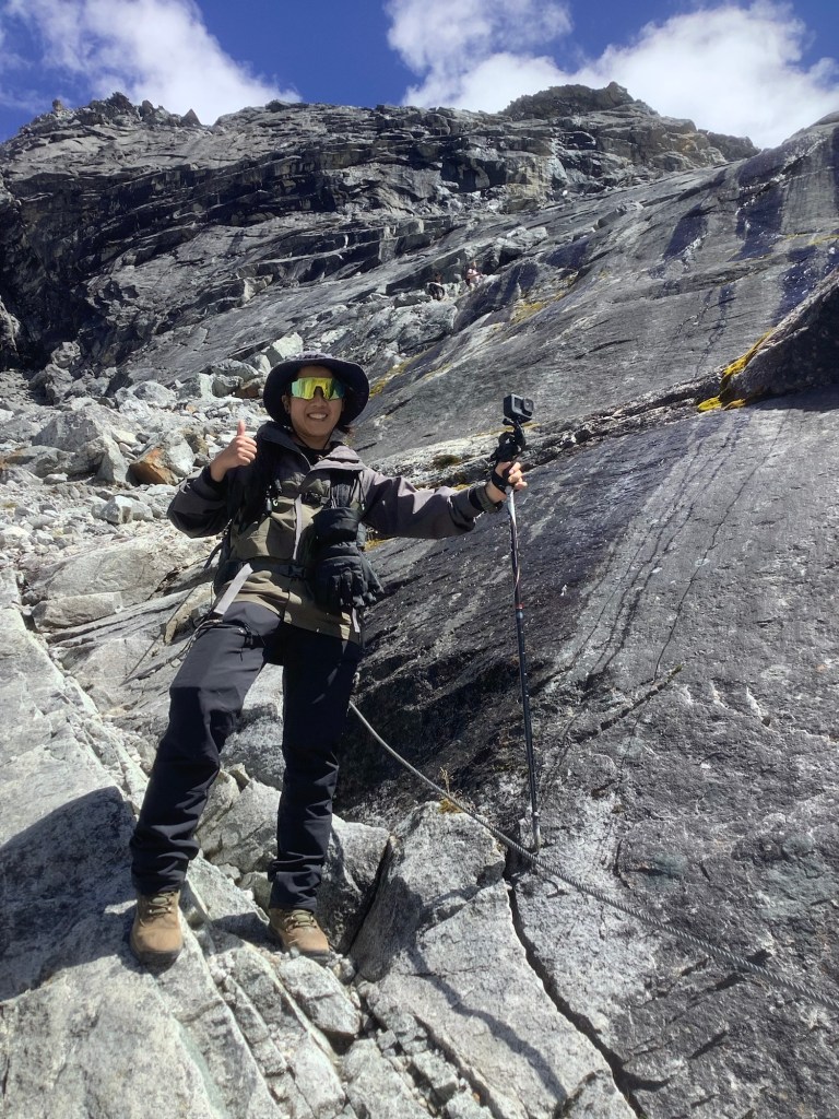 Nir and Bikram caught me up now we were proper climbing, although most of it was made safe by the wires. They made sure I didn’t do anything daft, particularly as there were patches of ice on the rock higher up and little pockets of snow. They were also happy to wait whilst I puffed and wheezed at frequent breather breaks. After nearly an hour the rock face became much less steep and I realised I could make the top in one go.