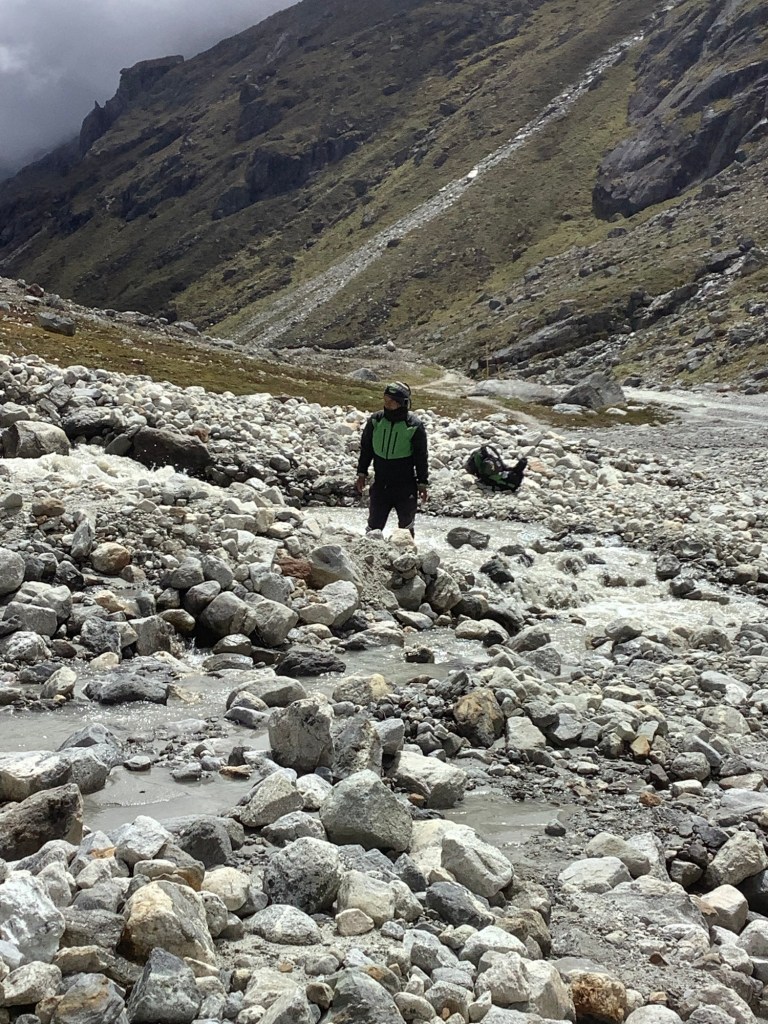 Now for a power drive down to Dzongla, our next destination. Scree scrambles and crossing streams that became rivers on stepping stones that we sometimes had to chuck in.