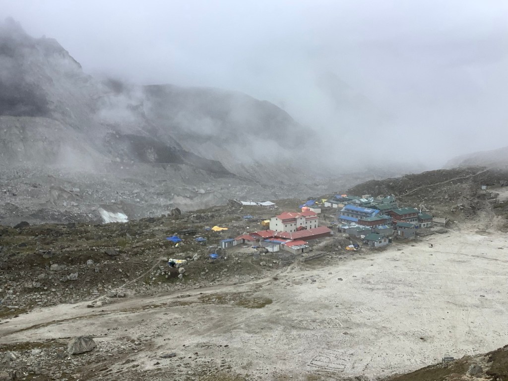 Looking down over the last ledge, Gorak Shep and its frozen lake were clearer.