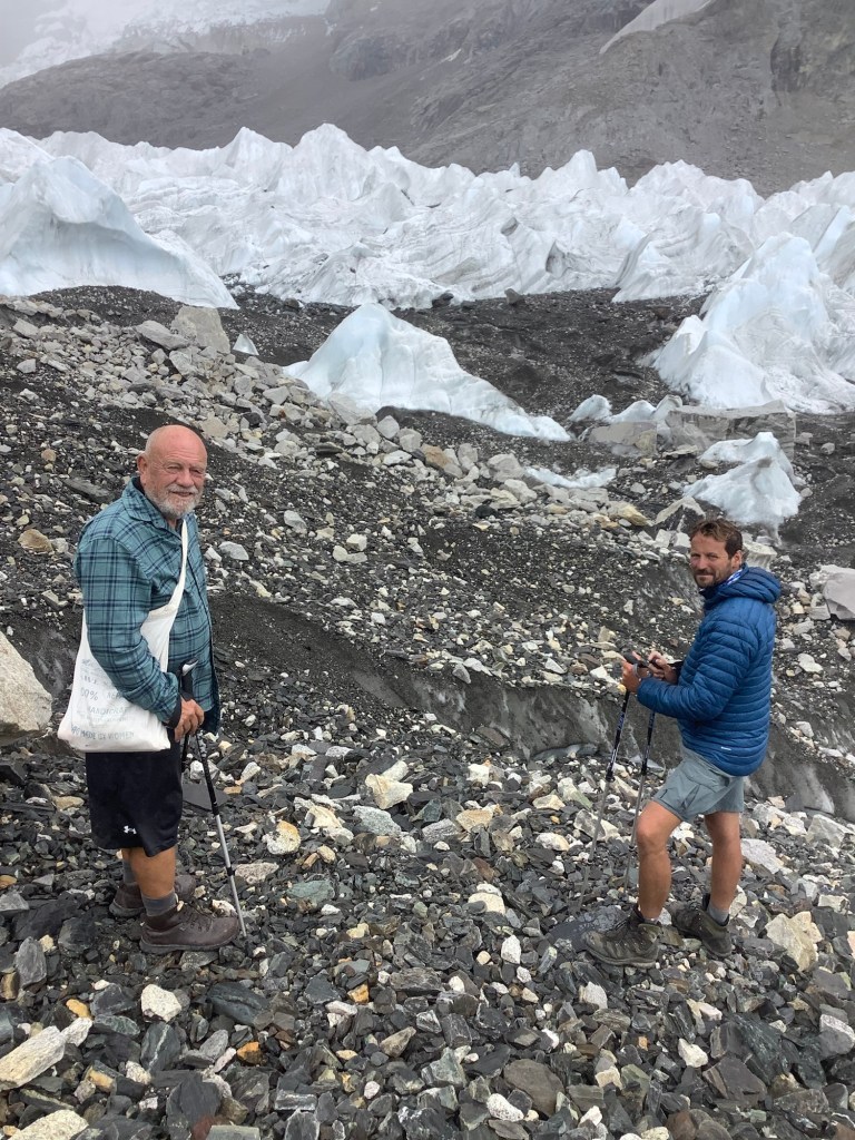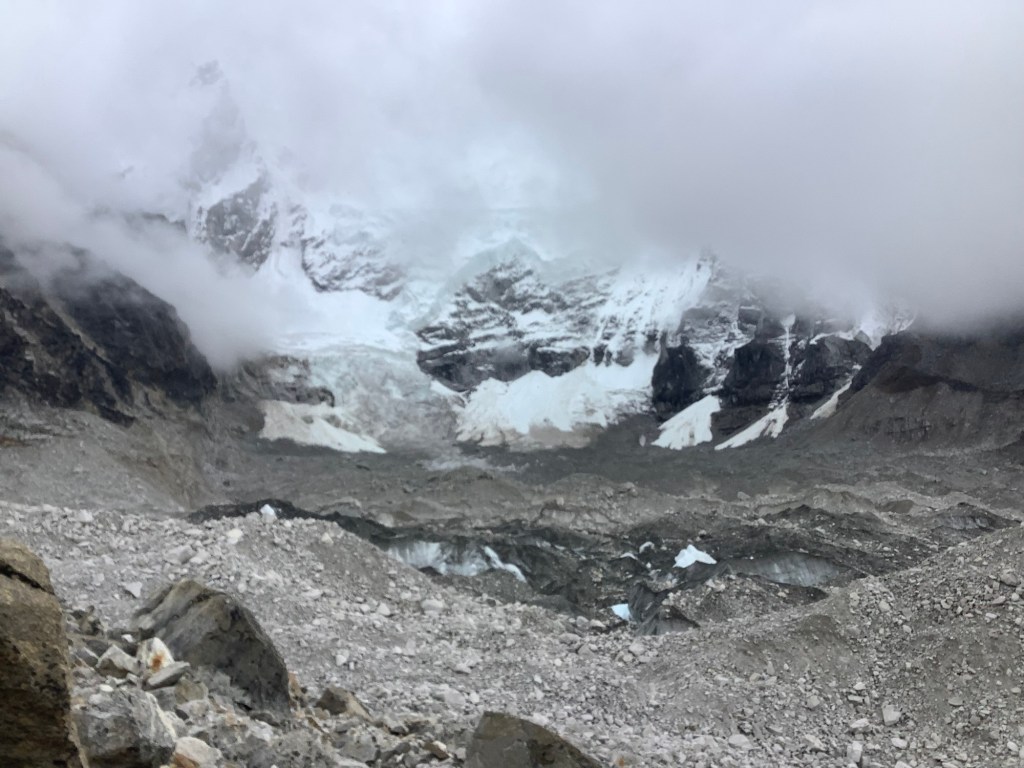 We made it comfortably up to Old Base Camp, despite our exertion up Kala Patthar this morning. The old place is noticeably closer to a deepening and widening crater filled with icy water. There is talk of not allowing people to it, due to the danger of collapse, although this is a particularly safe walk if you don’t arse about. Which means it’s dangerous for a twit like me. This is such a tourist money-spinner that I can’t see them scrubbing it.