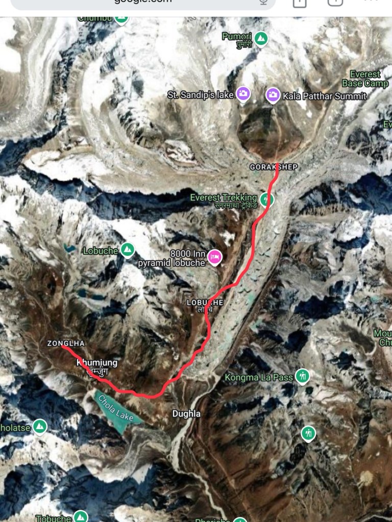 Nepali spelling of place names is not always consistent. Dzongla or Zongla is where we ended up last night, tired but elated after a great Cho La crossing. Today’s walk is in red on the map below. We’re effectively walking around Lobuche peak to Lobuche village for lunch. The grey canal to the right of the red line is the Khumbu glacier. After lunch we’re walking beside and along the glacier up to Gorak Shep.
