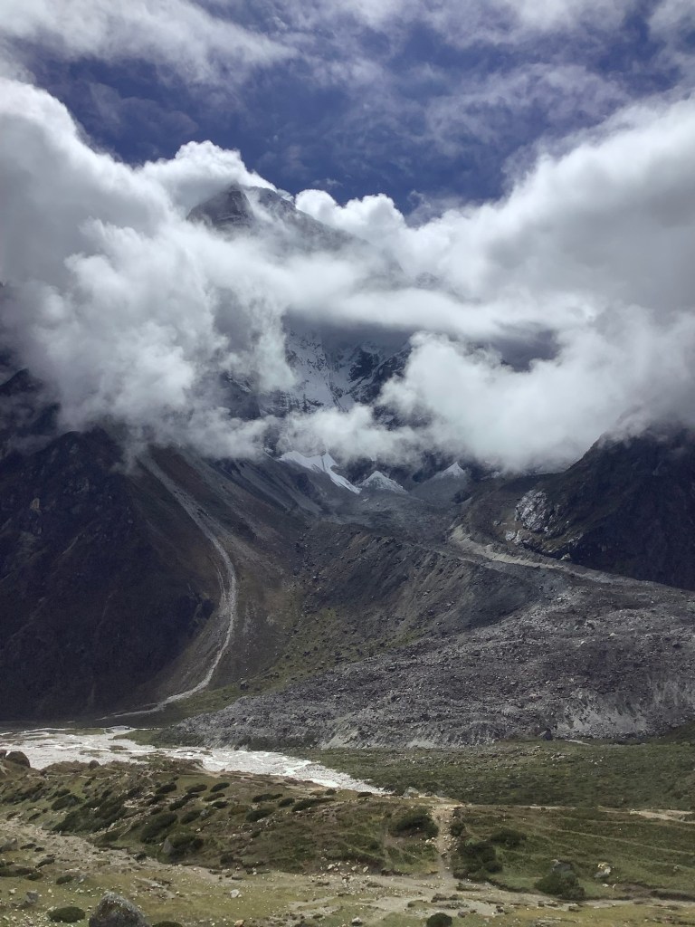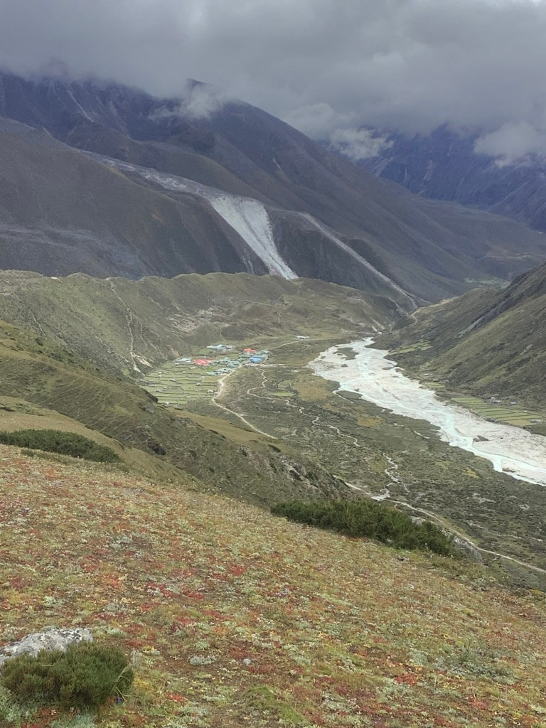 Amit, Nir and I dropped down the glacier as we were aiming initially for Dughla, where the track splits. There’s one route along the mountainside to Dingboche, and another down the mountain to Pheriche. We were going along and not down.