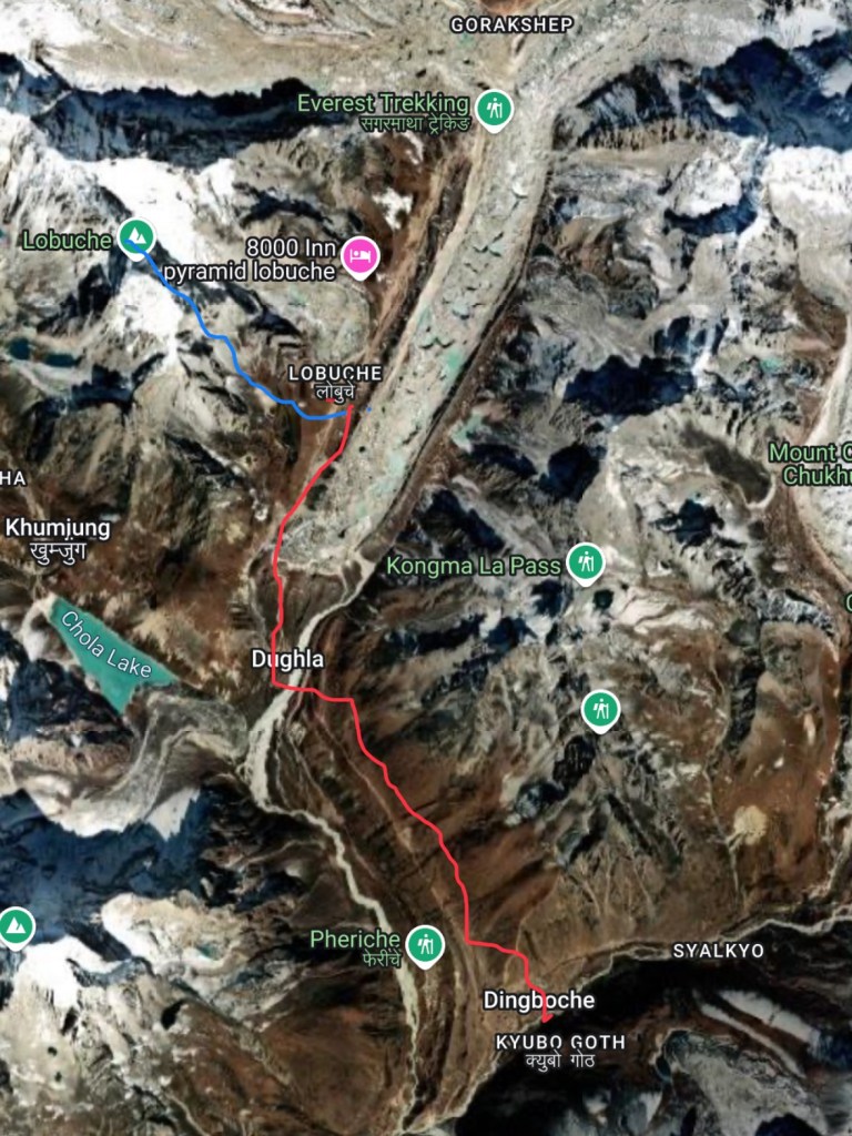 They were Carrying on up the Lobuche East. Oooer missus! (Blue route) And we were dropping down to Dingboche, a crossroads village up the Khyber. Sorry. Khumbu. (Red route)