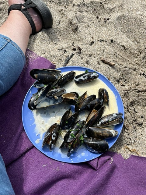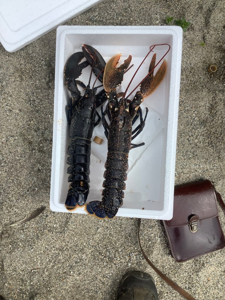 I owed my sis for petrol and various things she had bought and brought. So I bought two live lobsters and a kilo of mussels for a barbecue lunch at Lantic Bay. The tide was too far in for us to pick mussels off the cliffs, as I have done a few times down there. So I bought them, and paid off my debt to Che.