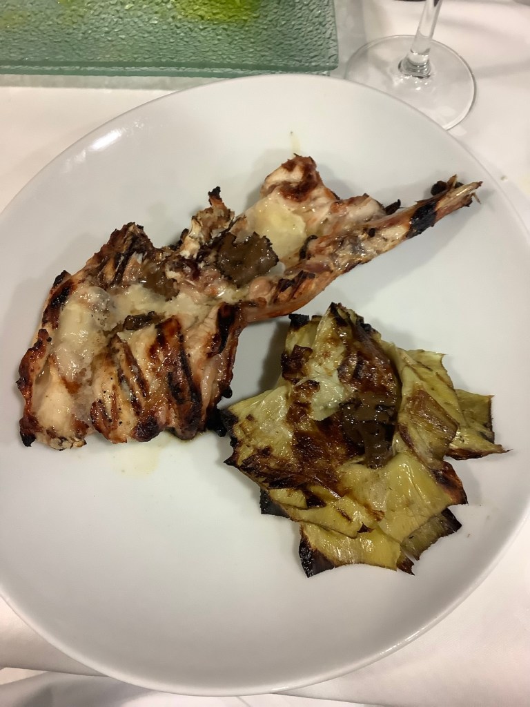 The hotel was deserted apart from the owner in her 80s. She was reluctant to serve us beer, but we’d earned it. She was happy to serve us a bottle of Rioja and a grilled rabbit with artichokes.