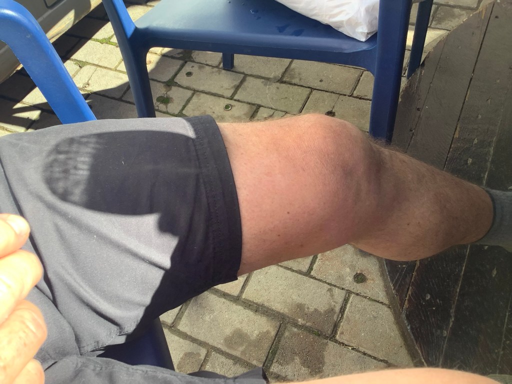 Then another major detour around a bunch of cows, bulls and bullocks blocking the path and showing an interest in us. An unhealthy interest some might say. A deadly interest I thought and Gary wasn’t waiting to test my theory. We legged it over walls and fences, culminating in me falling six feet backwards over a fence into a briar bush. Gary threaded himself ineffectually through a multi-stranded barbed wire fence. It’s amazing how well he bleeds. And as the miles wore on he was struggling more and more with his painful knee problem.