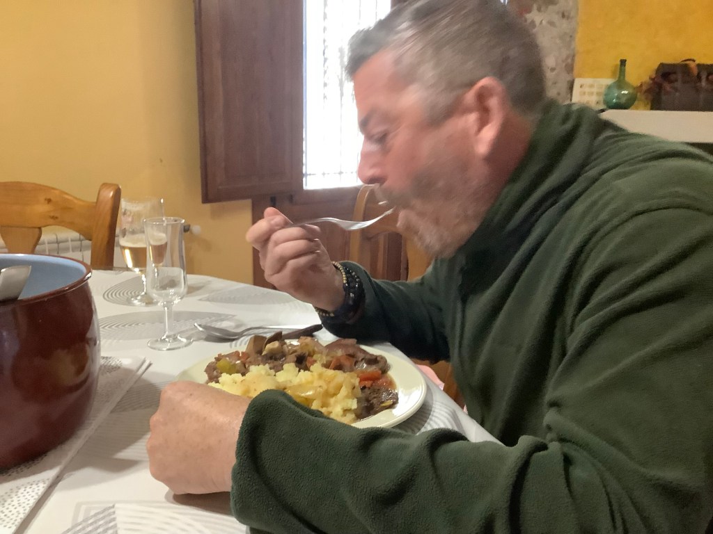 The last 200 metres up a track into Vistabella were agony for him. It took him half an hour. We went to the only bar in town and found Dolores, the owner of the apartment which we were staying at. There was no problem with the reservation and she would take us via the butchers and the grocers to the apartment. We bought three types of sausages, wine, bread, butter beans and tomatoes and made a fabada bean dish. Just what the doctor ordered.