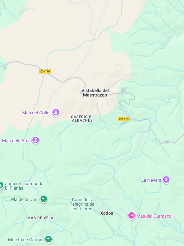 We had two hotels booked and paid for ahead on the trail but Vistabella only has one road through it, the CV-170, and that runs west to east. Our trek would have taken us south, and to get to the next location by road would be over 50 miles. So we had to let the bookings go. Unfortunate but unavoidable.