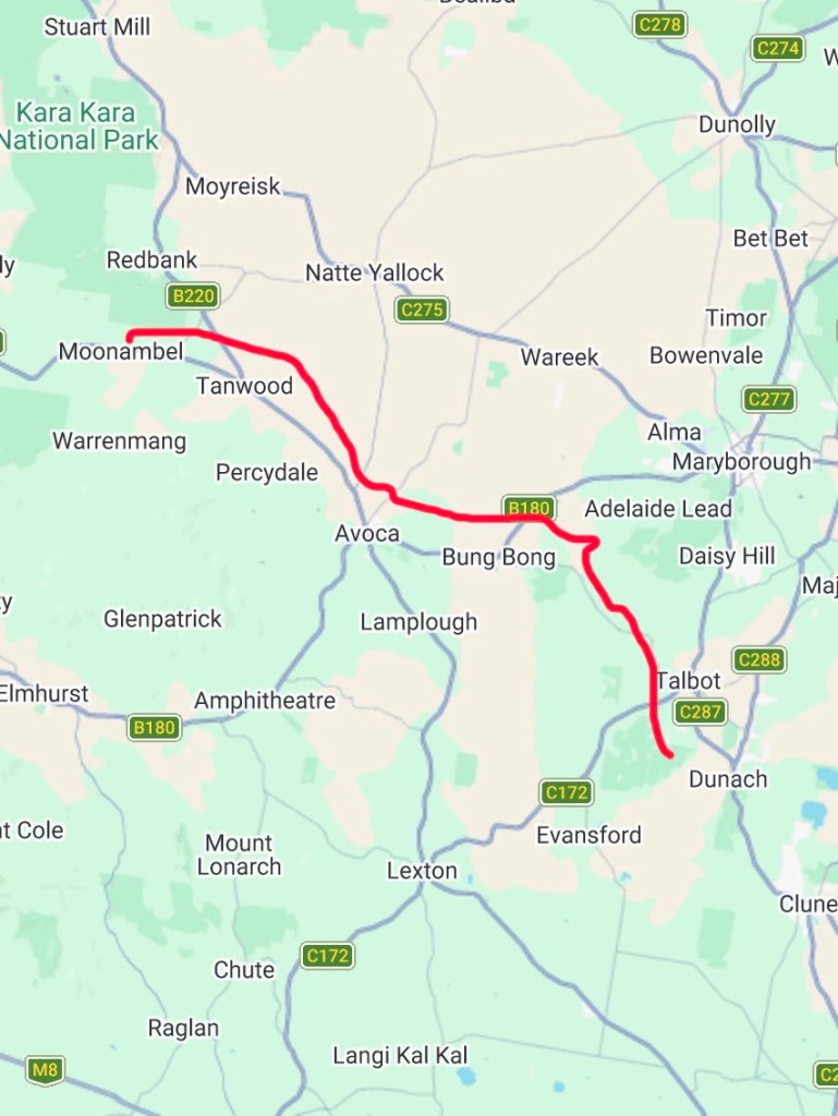 Stu had warned me to watch out for kangaroos. When I got past Bung Bong a huge buck leaped across the road in front of me, causing me to slam on the anchors and nearly shit myself. One of those leaping buggers, illuminated by the car lights as I’m doing 50mph, is quite disconcerting, as it narrowly misses landing on your bonnet.