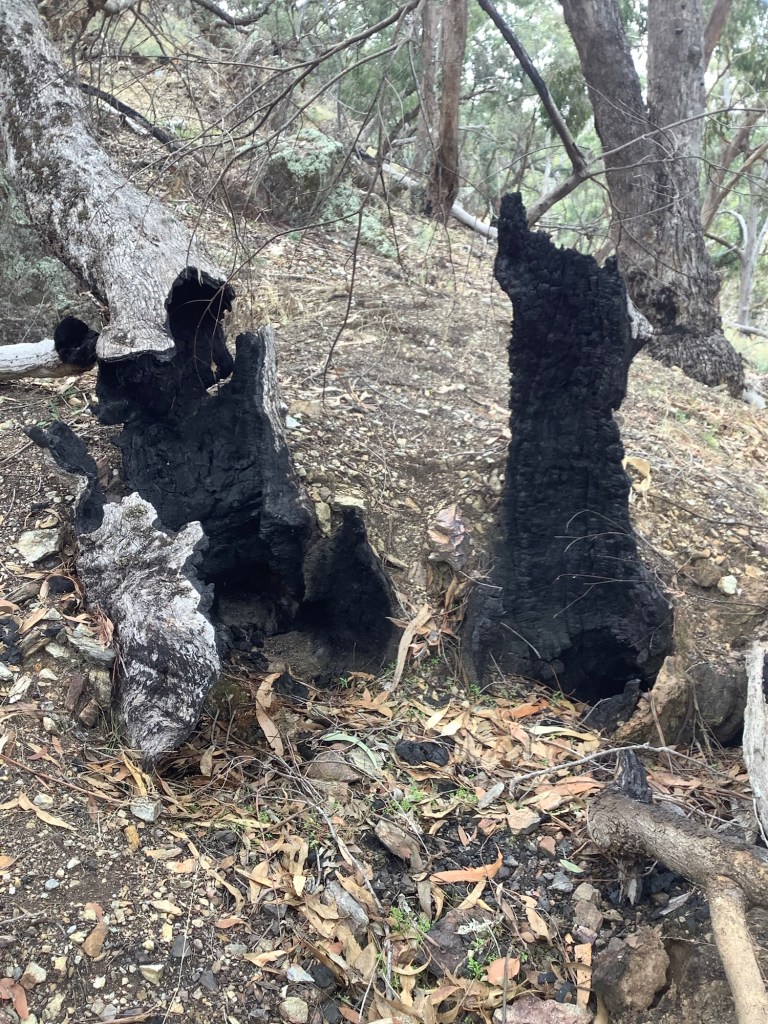 There are a lot of burnt out areas where fires have ravaged the forest. The eucalyptus trees have so much spirit in their core that the centre burns out and some of the outer layer remains. In fact the remains remain.