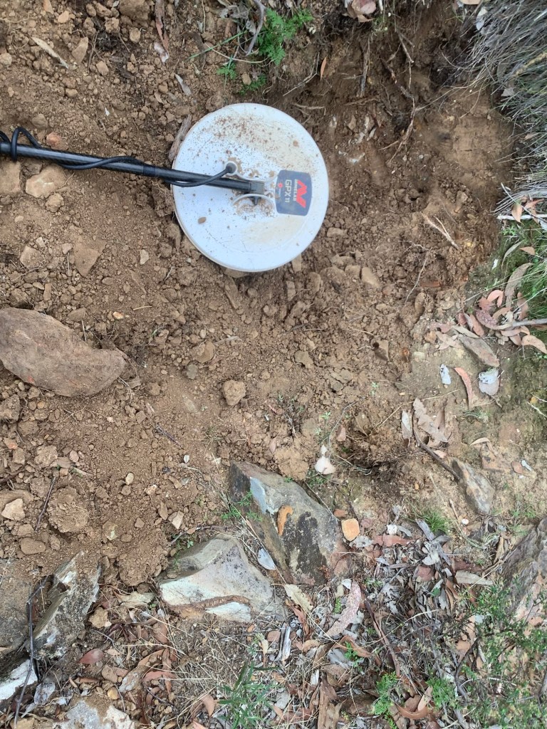 The result was the brown piece of iron looking like a curly turd two feet south of my detector perched on a rock in the photo below.